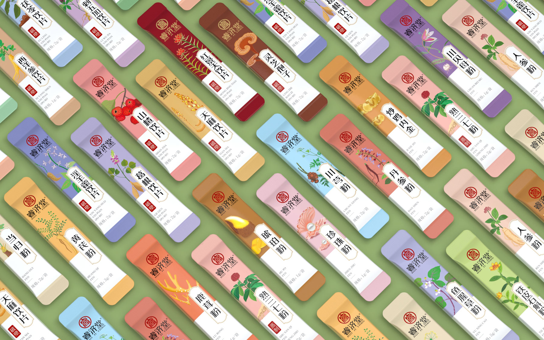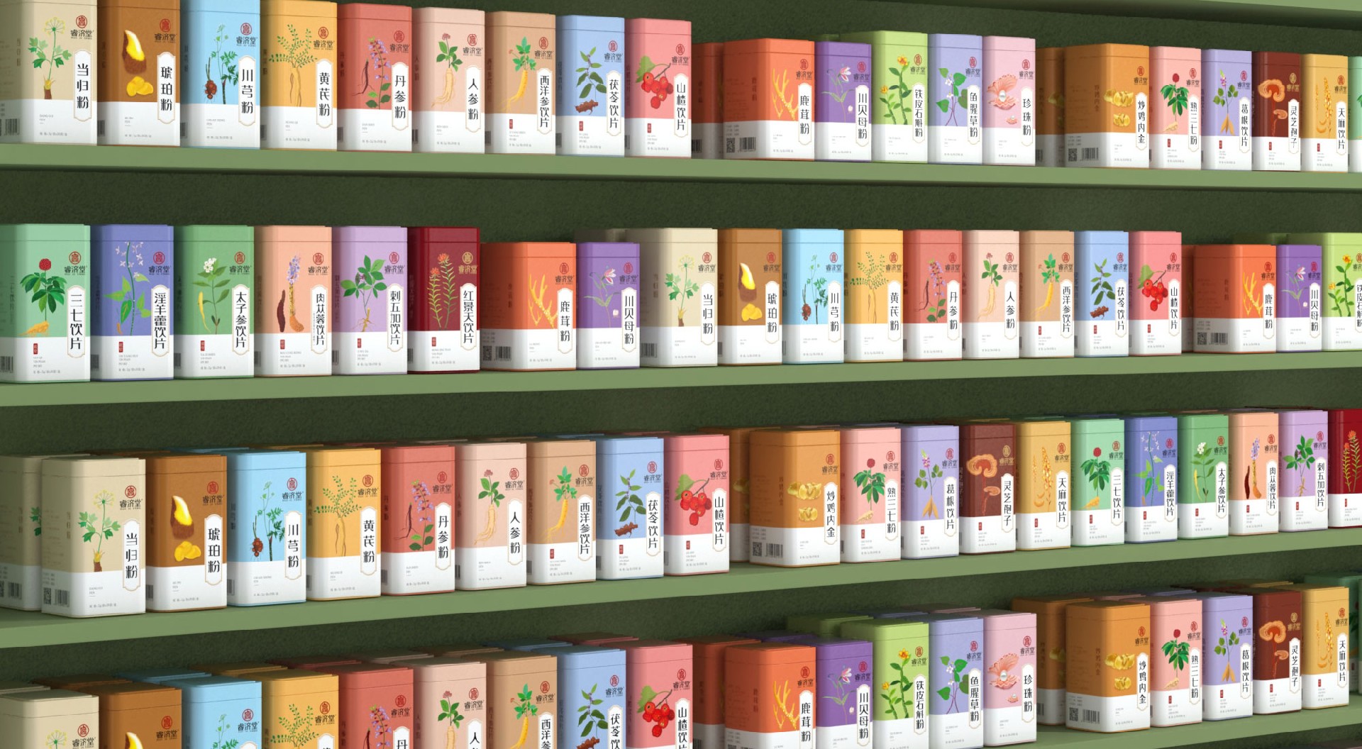 中醫藥學是中國傳統文化的瑰寶,數千年來為中華民族的繁衍和中華文化的傳承作出了偉大的貢獻,中醫藥注重人與自然、人與社會的和諧統一,強調因時因地因人製宜的思想。亙一中藥飲片包裝設計公司為睿濟堂中藥目前開發的鐵盒裝中藥破壁粉、中藥飲片包裝設計共計二十五個品種,包含鐵皮石斛粉、人參粉、珍珠粉、鹿茸粉、琥珀粉等中藥破壁粉包裝設計共計十四款產品,肉蓯蓉、紅景天、淫羊藿、西洋參等中藥飲片包裝設計共計十一款產品。
