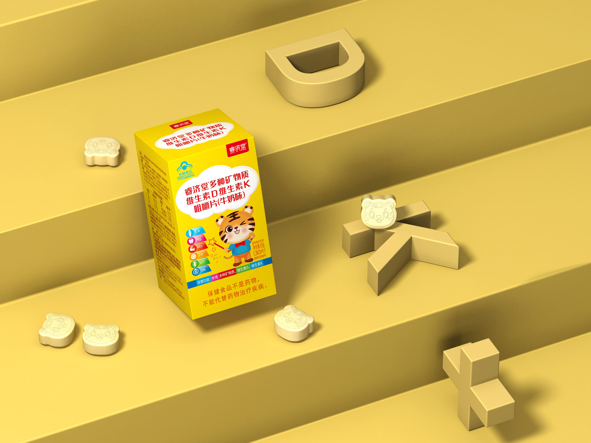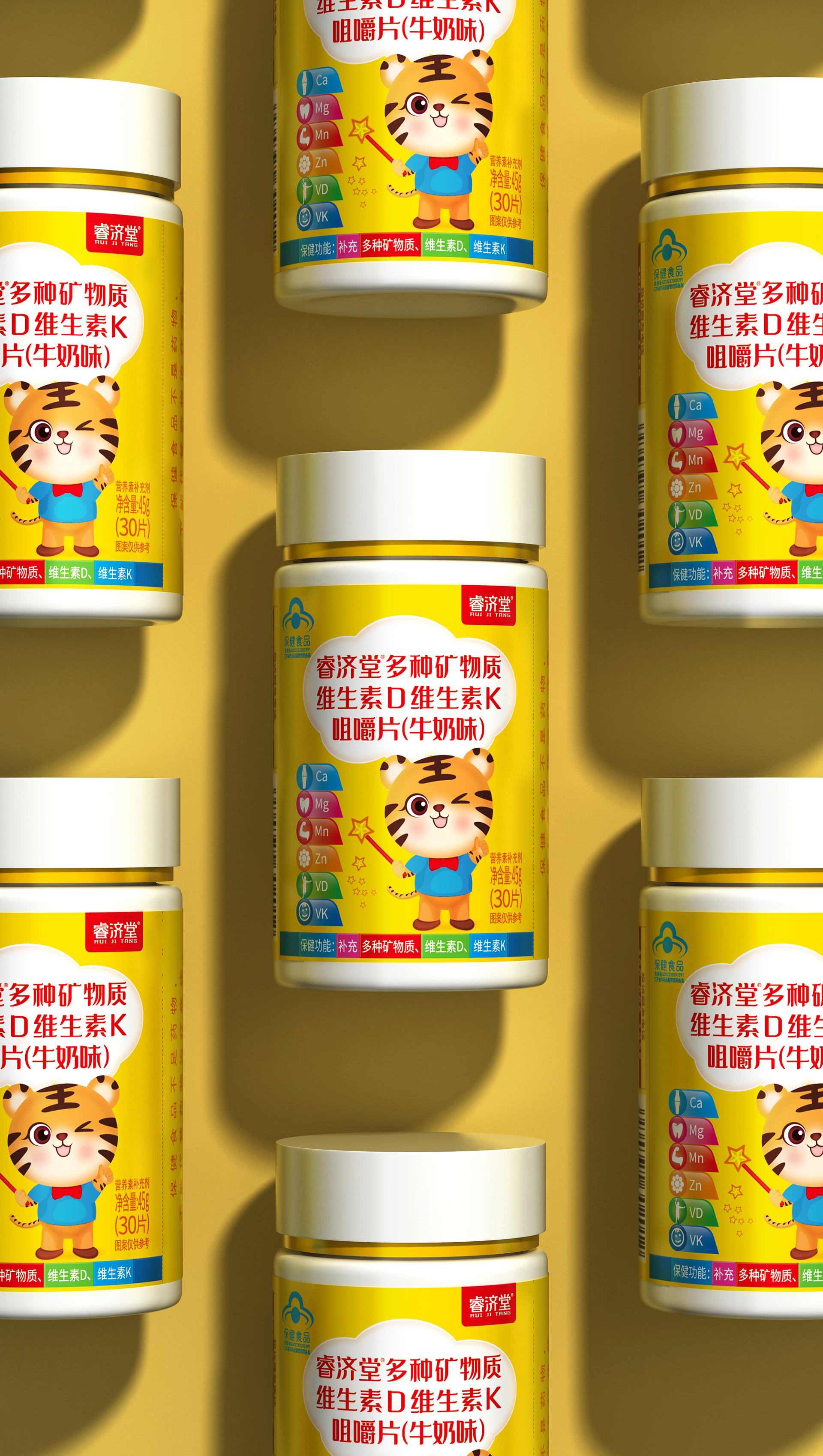多種礦物質維生素D維生素K咀嚼片(牛奶味)兒童裝的超級符號——小老虎,是從與兒童少年有天然聯係的文化符號、生活場景中而來的,小老虎是少年的符號、健康的符號、成長的符號、食欲的符號。在少年兒童的世界裏,小老虎的形象一直伴隨著他們的成長,《巧虎》、《小熊維尼與跳跳虎》、《森林王子》、《宇宙護衛隊》、《小虎曆險記》、《玩偶奇兵》、《功夫王之萌虎上山》、《小虎墩大英雄》......眾多的影視作品已經將小老虎形象植入到他們的精神世界,強壯、勇敢、正直、善良、冒險、成長是小老虎公共形象認知,睿濟堂小萌虎,就是嫁接兒童少年最鍾愛最熟悉的符號,讓兒童一看就喜歡,一看就想吃!