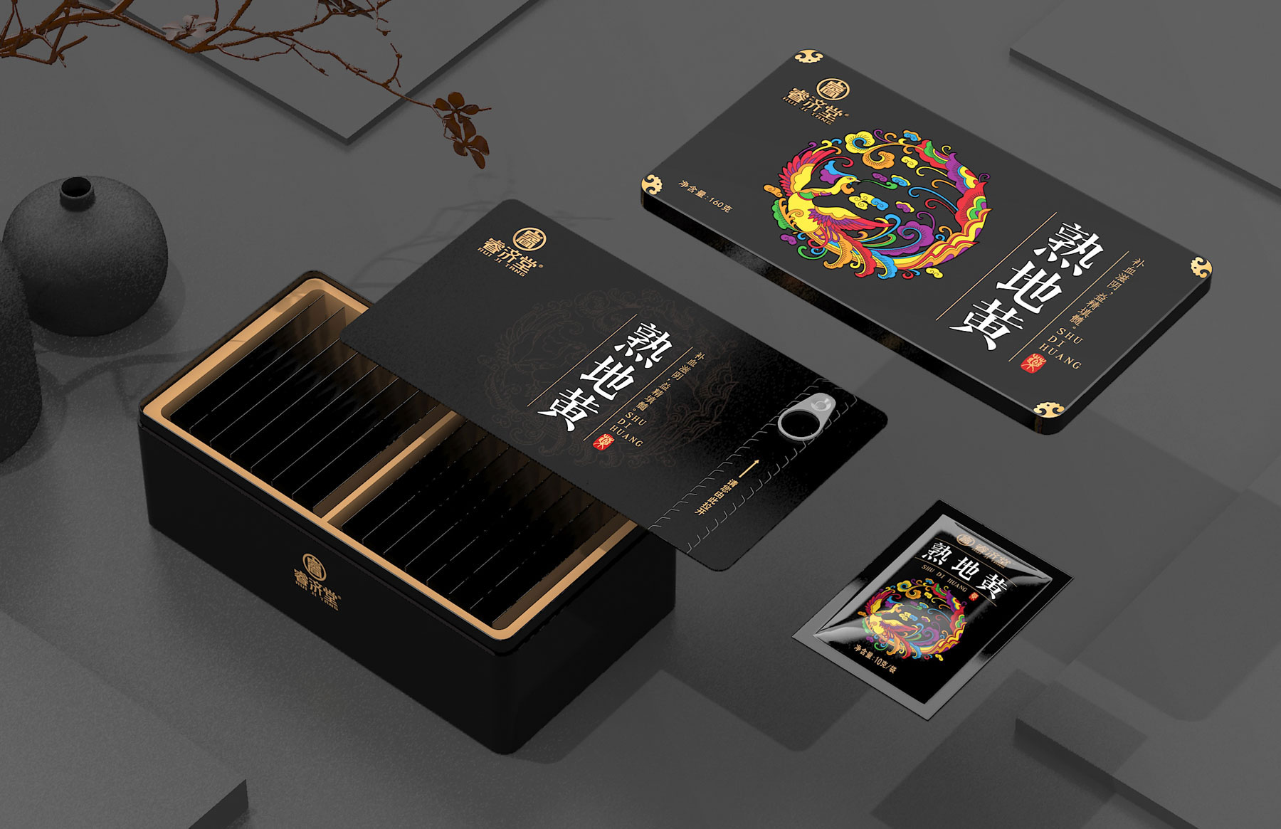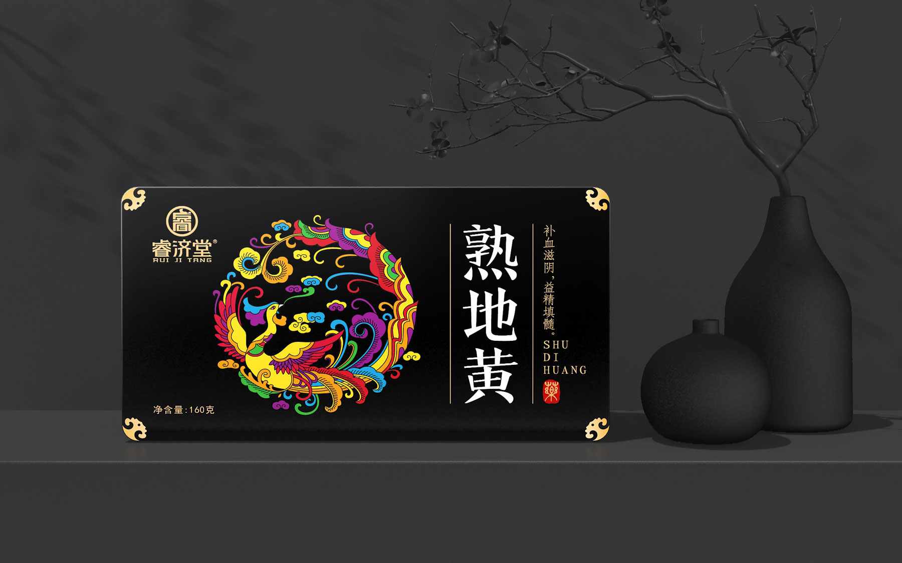 亙(gen)一(yi)中(zhong)藥(yao)飲(yin)片(pian)包(bao)裝(zhuang)設(she)計(ji)公(gong)司(si)認(ren)為(wei),將(jiang)傳(chuan)統(tong)中(zhong)藥(yao)飲(yin)片(pian)包(bao)裝(zhuang)設(she)計(ji)轉(zhuan)換(huan)為(wei)大(da)健(jian)康(kang)產(chan)品(pin)包(bao)裝(zhuang)設(she)計(ji)思(si)路(lu)切(qie)入(ru)市(shi)場(chang),包(bao)裝(zhuang)設(she)計(ji)的(de)本(ben)質(zhi)就(jiu)是(shi)設(she)計(ji)購(gou)買(mai)理(li)由(you),放(fang)大(da)購(gou)買(mai)理(li)由(you)。中(zhong)藥(yao)飲(yin)片(pian)包(bao)裝(zhuang)設(she)計(ji)是(shi)設(she)計(ji)產(chan)品(pin)自(zi)媒(mei)體(ti),貨(huo)架(jia)廣(guang)告(gao)位(wei)!我們以品牌產品獨一無二的五彩團鳳專屬符號為基礎,以自媒體思維、貨(huo)架(jia)思(si)維(wei)方(fang)法(fa)設(she)計(ji)熟(shu)地(di)黃(huang)包(bao)裝(zhuang),讓(rang)產(chan)品(pin)自(zi)己(ji)會(hui)講(jiang)話(hua)。睿(rui)濟(ji)堂(tang)熟(shu)地(di)黃(huang)中(zhong)藥(yao)飲(yin)片(pian)包(bao)裝(zhuang)設(she)計(ji)主(zhu)體(ti)色(se)為(wei)漆(qi)黑(hei)色(se),就(jiu)是(shi)傳(chuan)遞(di)睿(rui)濟(ji)堂(tang)熟(shu)地(di)黃(huang)恪(ke)守(shou)九(jiu)蒸(zheng)九(jiu)製(zhi)古(gu)法(fa)工(gong)藝(yi),曆(li)時(shi)28天蒸曬,確保發揮藥材功效,讓熟地黃道地良藥功效更強;產品具有黑如漆、光如油、甘如飴的優點。睿濟堂熟地黃以“五彩團鳳”專屬符號風姿卓越華貴典雅,代表睿濟堂熟地黃可幫助養血,補虛,滋陰,滿足補血滋陰,益精填髓。傳遞品牌產品核心價值訴求:養血補虛熟地黃,道地良藥全家享!
