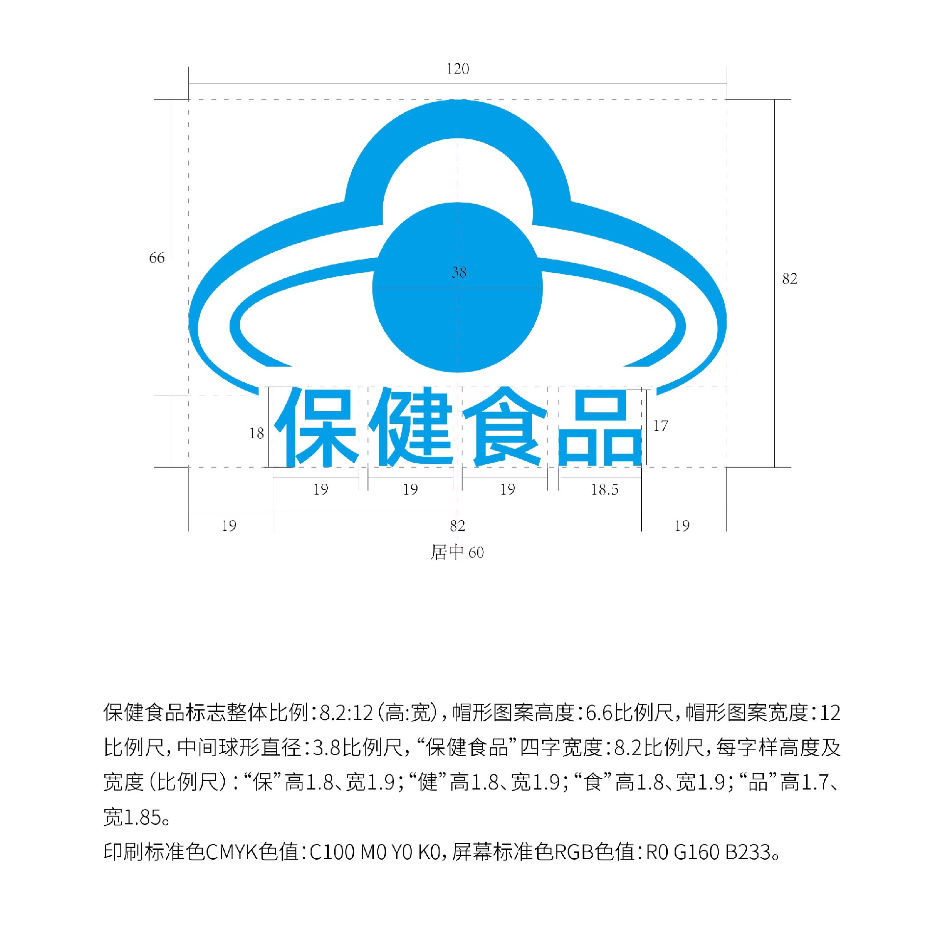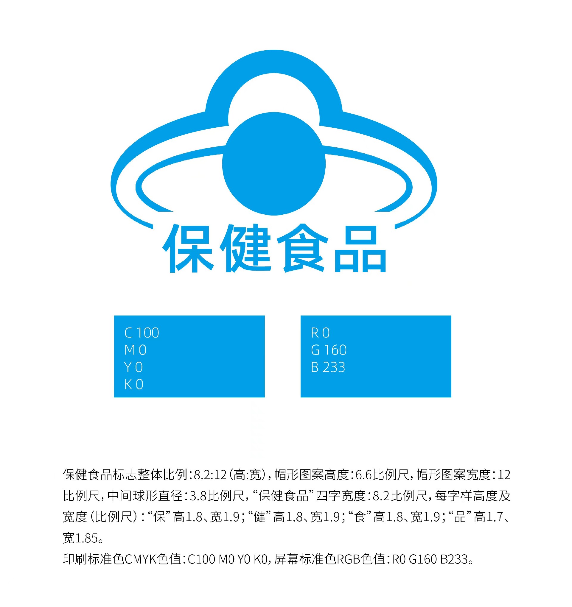 六、保健食品標誌印刷標準色 CMYK 色值為 C100 M0 Y0 K0,屏幕標準色 RGB 色值:R0 G160 B233。